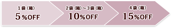 2袋(箱)~3袋(箱)で10%OFF、4袋(箱)で15%OFFと割引率がアップしていきます。