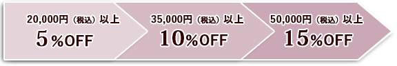 20,000円(税込)以上ご購入で5%割引、35,000円(税込)以上ご購入で10%割引、50,000円(税込)以上ご購入で15%割引となります。