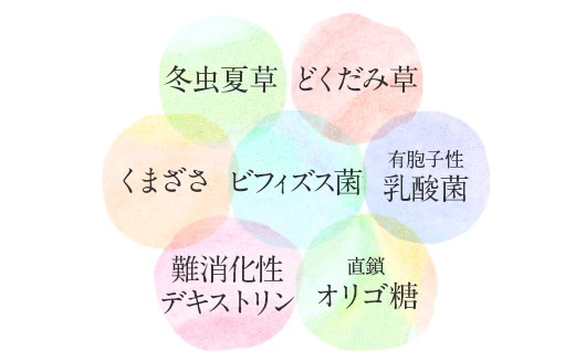 さらに7つの有用成分をプラス!腸内の善玉菌に働きかける「ビフィズス菌」「乳酸菌」「オリゴ糖」「食物繊維」や、美容面も意識した有用成分を豊富に含んだ「くまざさ」「どくだみ草」に加え、生活習慣が気になる方などに期待されている「冬虫夏草」が含まれています。