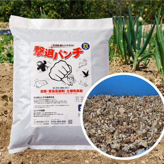 国産の天然乾燥ヒトデ100%を使用した害獣・害鳥忌避剤です。イノシシ・シカ・ハクビシン・キツネ・アナグマ・アライグマ・イタチ・モグラ・ネズミなどの害獣やカラス・ハト・ムクドリなどの害鳥を寄せつけません。もちろん薬品などの化学的なものは一切配合していない天然成分だけで作っていますので、作物や人に全く害がなく安心・安全です。