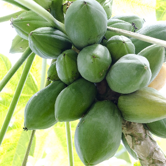酵素、ポリフェノールやビタミンCを豊富に含んだ「青パパイヤ」一般的に皮が青い未熟な状態のパパイヤである青パパイヤには、「パパイン」というタンパク質を分解する酵素が多く含まれます。さらに、アミノ酸、ビタミンC、食物繊維、ポリフェノールなど美と健康に必要な栄養素をバランス良く含んでいます。