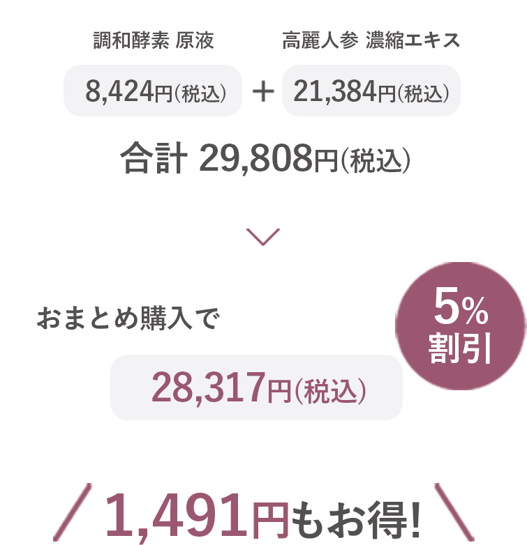 調和酵素 原液 8,424円(税込)と高麗人参 濃縮エキス 21,384円(税込)の2商品をご購入の場合